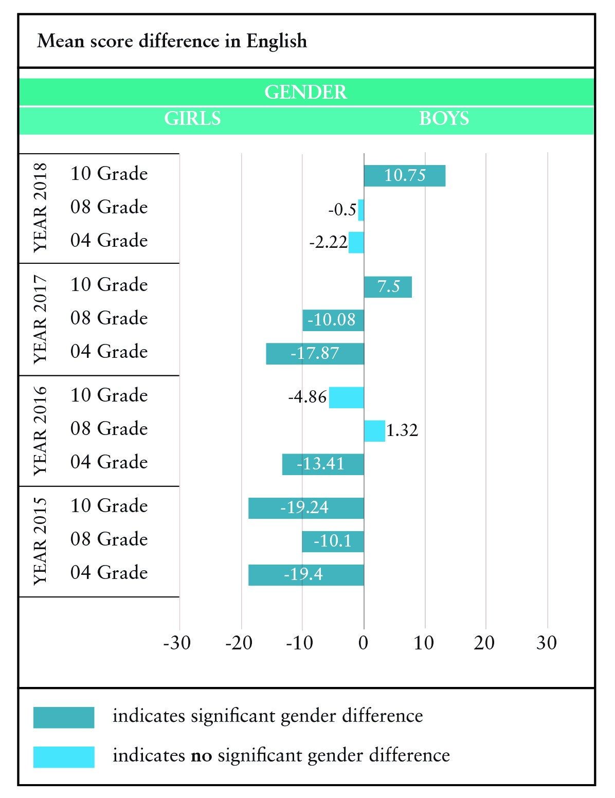 An interesting finding is that girls have performed better than boys in English. The English tests assess students’ higher order thinking skills along with reading skills, including the ability to interpret, infer and evaluate based on a given context. Therefore, better performance of girls in English would appear to indicate that any disparity in performance in science and mathematics is unlikely to be due to poor language skills or the ability to read and comprehend.