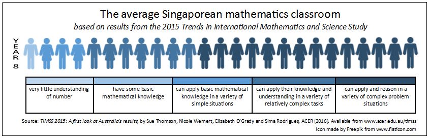 In an average Year 8 Singapore mathematics classroom, no students are under the low benchmark, and only one student would not have achieved the Australian proficient standard. However, more than half of the class would have achieved the highest level – showing deep understanding of the material they were presented with. In Year 8 science, 43 per cent of Year 8 students in Singapore were similarly in the top category of achievement.
